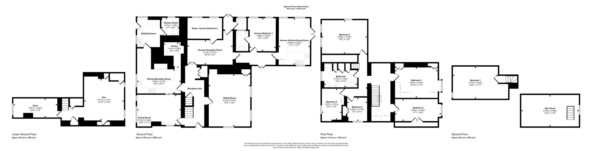 The annexe was converted eight years ago, having been one of the town's dental practices. This lovely addition provides single storey (with no steps) flexible usage and multi functional rooms with exceptionally high ceilings that make it hard to date - although it is thought that the original structure was Victorian. It has its own entrance to the side of the building. The accommodation consists of entrance hall with door to the cloakroom and to the main reception room, which has double lockable doors to the main house. There are two double bedrooms, one with en-suite shower room and one currently being used as a study. An inner hall leads to the kitchen/dining room, which boasts a triple aspect with sash windows to the sides and double doors opening to the rear garden and paved seating area. The kitchen area is fitted with plenty of soft closing cupboards with corner carousel and pull out bin store, generous amount of work surfaces, a four ring induction hob and one and half bowl sink and drainer with swan neck mixer tap. There is space for under counter appliances (available by separate negotiation) and built in eye level double electric oven with warming drawer.