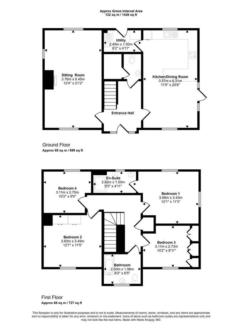 The property is approached from the drive to an attractive frontage with arched storm porch to the front door - this is flanked by two full height windows, transom window - and opens into a welcoming and bright reception hall with Amtico wood effect flooring and oak doors to the cloakroom, kitchen/dining room and to the sitting room. The cloakroom is fitted with a modern suite of low level WC with concealed cistern and a vanity wash hand basin plus a door to the large understairs storage cupboard. The sitting room boasts a triple aspect with sash windows to the side, front and rear with view over the garden to the adjoining countryside. There is a fireplace with a slate hearth and wood burner. From the dining area there is a sash window overlooking the drive and glazed door with full height windows to either side, which opens to the side paved sun terrace. The kitchen area has a sash window overlooking the rear garden and fields beyond and is fitted with a range of stylish Shaker cabinets and units. There is a generous amount of quartz work surfaces with matching upstand and inset one and half bowl sink with swan neck mixer tap. The built in appliances include side by side electric ovens and induction hob with an extractor hood above, fridge/freezer and dishwasher. The floor is laid to Amtico wood effect flooring. The utility room has a door to the rear garden, cupboard housing the gas fired central heating boiler plus floor and eye level cupboards and space and plumbing for a washing machine and tumble dryer. The ground floor benefits from underfloor heating.