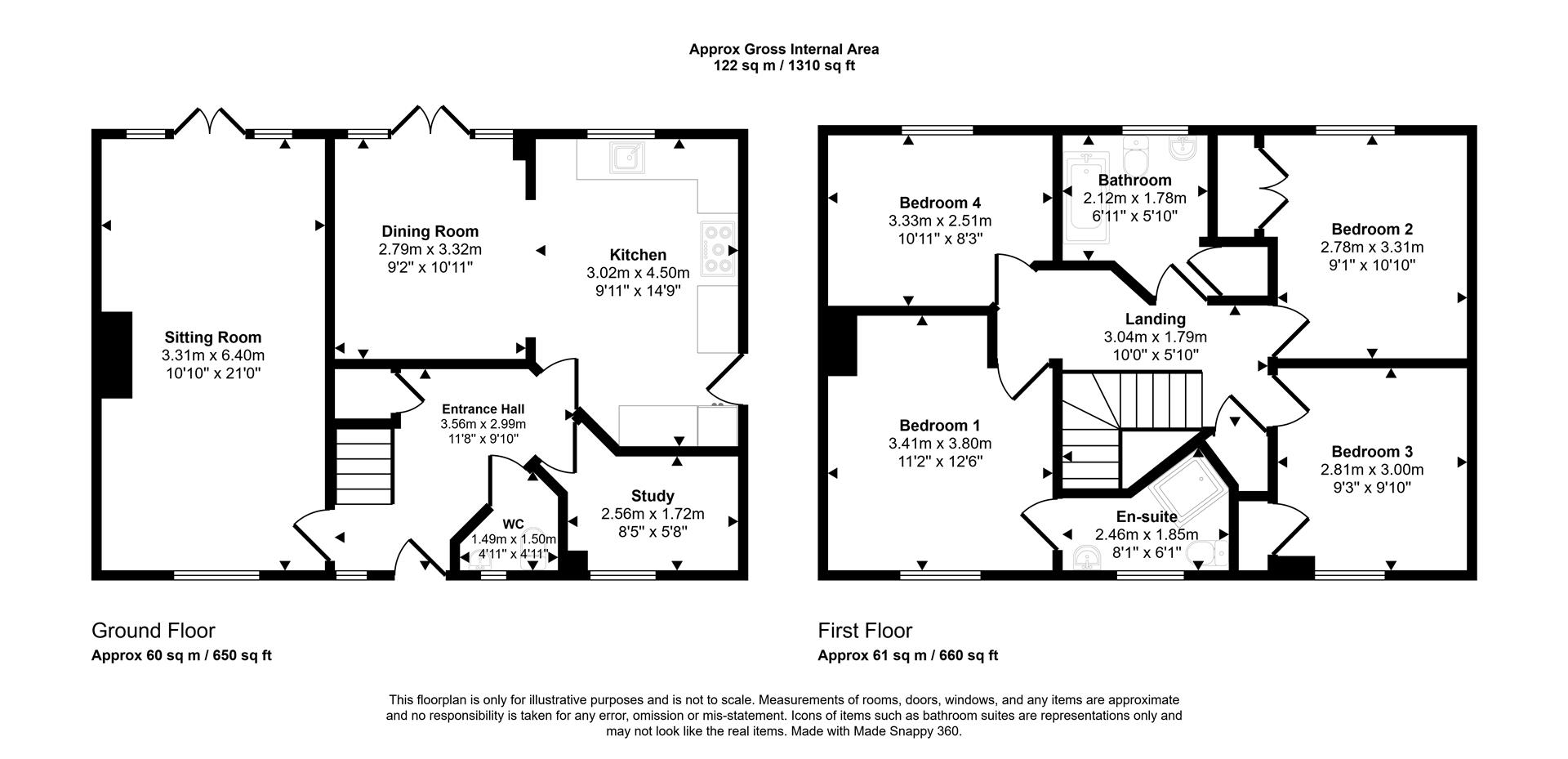 Upon entering the property there is a good sized and welcoming entrance hall with wood effect flooring laid throughout the ground floor except the sitting room and study. The sitting room is spacious and bright with patio doors leading out to the rear garden. There is a study which provides a separate space for working from home or reading. The heart of the home is the kitchen/dining room which is bright and airy - making it a great spot for dining and entertaining. The kitchen has a good amount of eye and floor level storage as well as space for appliances such as a washing machine, dishwasher and a Belling cooker. There are patio doors from the dining room leading out to the rear garden. Adding to the convenience of the downstairs accommodation, there is a cloakroom with a pedestal style wash hand basin and a low level WC.