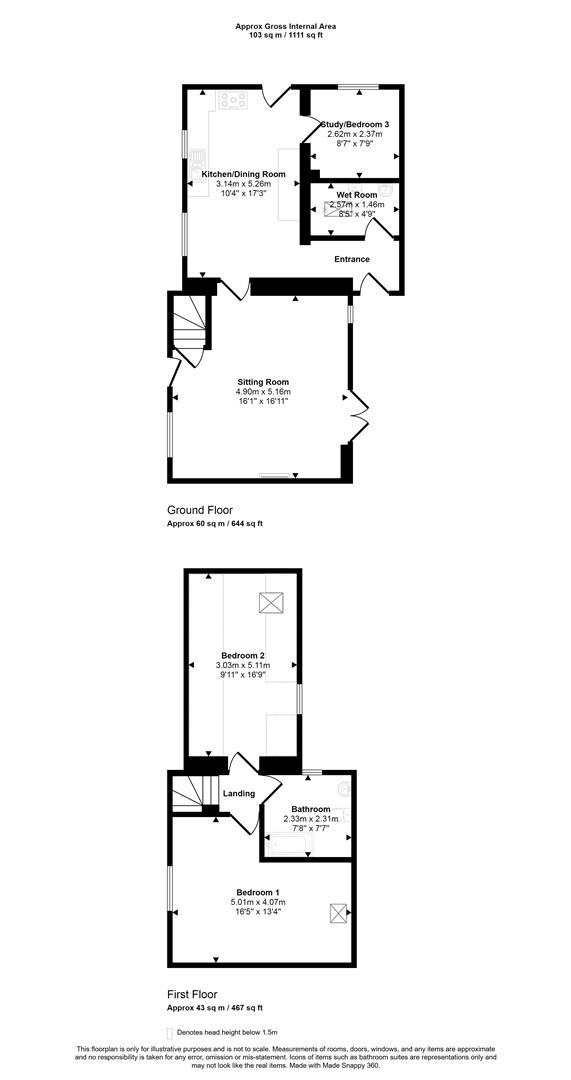 The spacious sitting room is full of warmth, centred around a fireplace with a wood-burning stove, and double doors opening onto the rear garden—perfect for indoor-outdoor living. Downstairs also includes a handy study, which could also be a bedroom, and a modern wet room. Upstairs are two double bedrooms, each with its own character—one with sloping ceilings and restricted headroom, enhancing the cottage's cosy appeal. The bathroom completes the first floor.