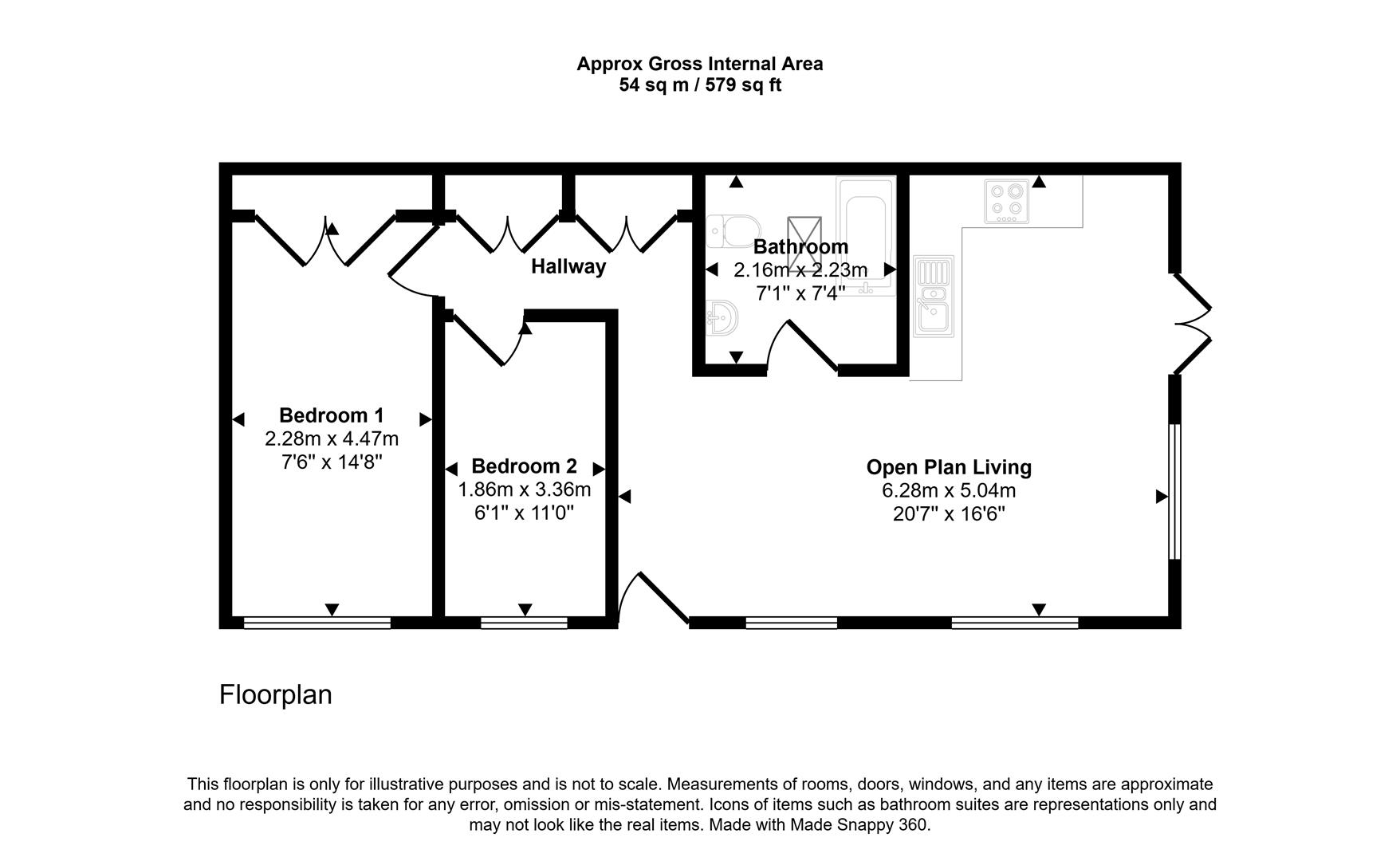 From the open plan living space there is an opening into the inner hall where there is a large storage cupboard plus a utility cupboard that houses the gas boiler and has space and plumbing for a washing machine. Also from the hall are doors leading off to the two bedrooms. The main bedroom has a large built in wardrobe.