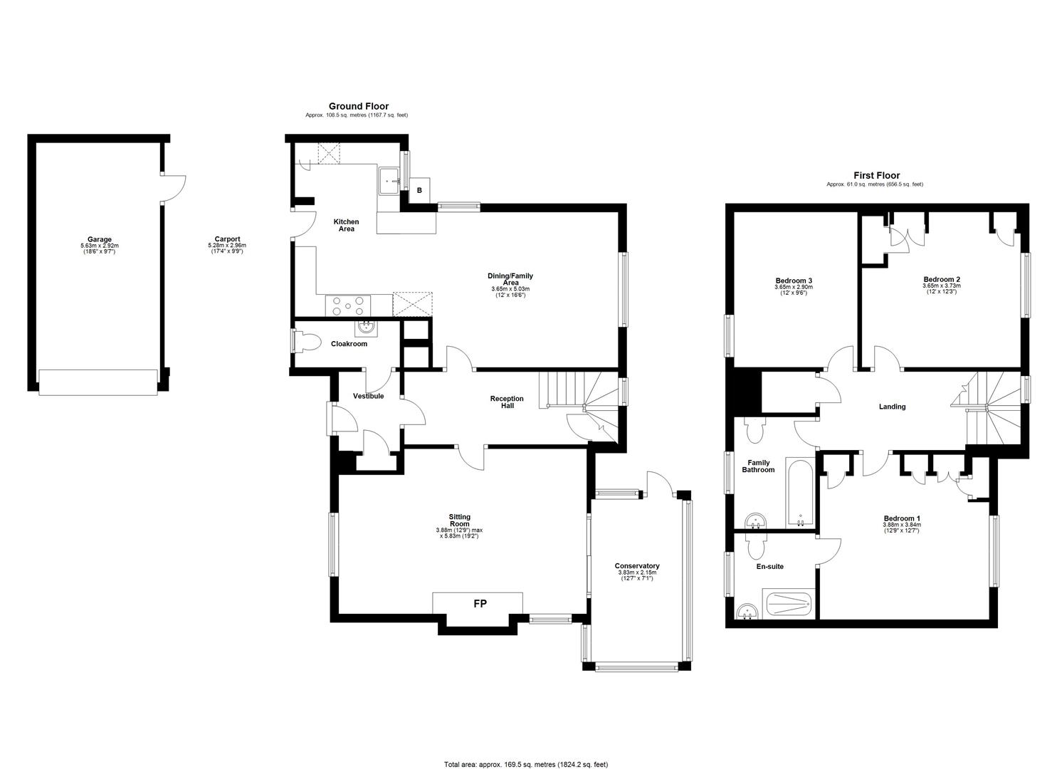 To the front and side of the property, there is a garage and carport, providing off-road parking and additional storage.