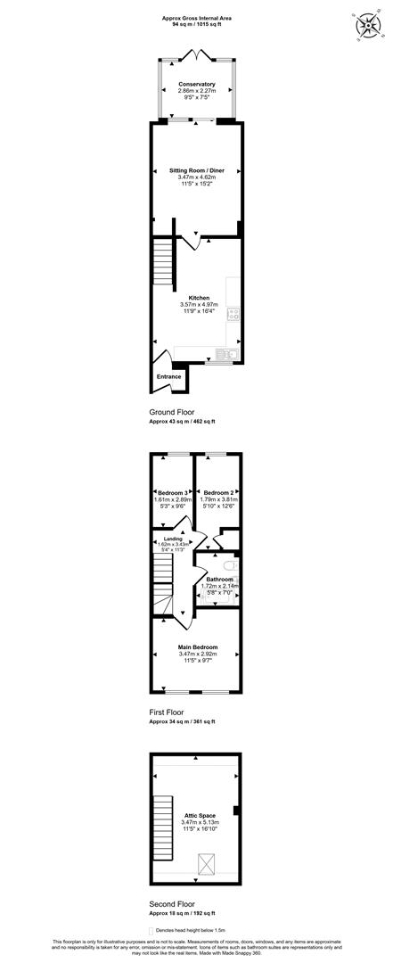 The accommodation comprises a good sized kitchen with space for a dining table, a sitting room and a conservatory to the ground floor. To the first floor, three bedrooms are served by a family bathroom, with a useful storage room found on the second floor.